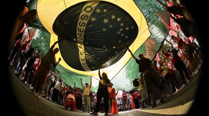 Manifestantes levantam uma grande bandeira do Brasil durante ato contra